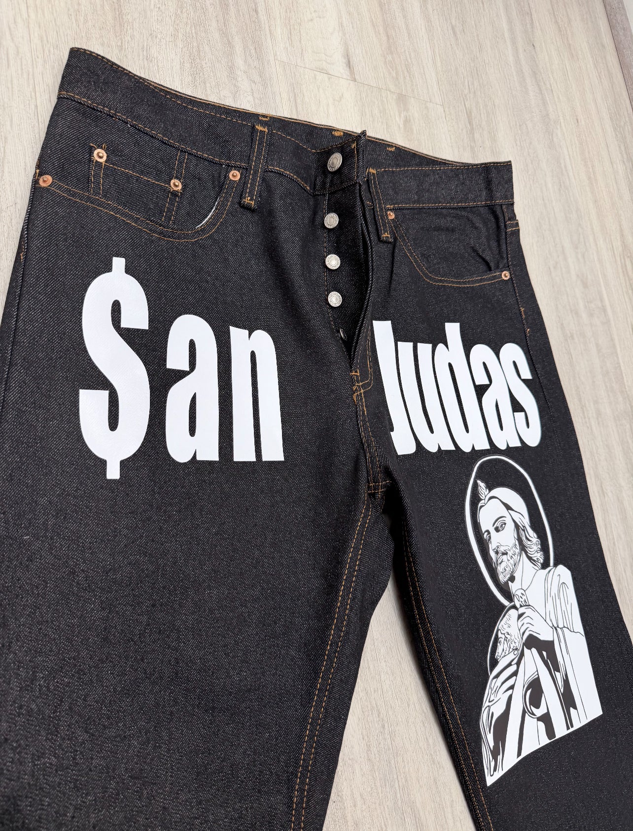 - San Judas printed vertically on leg
