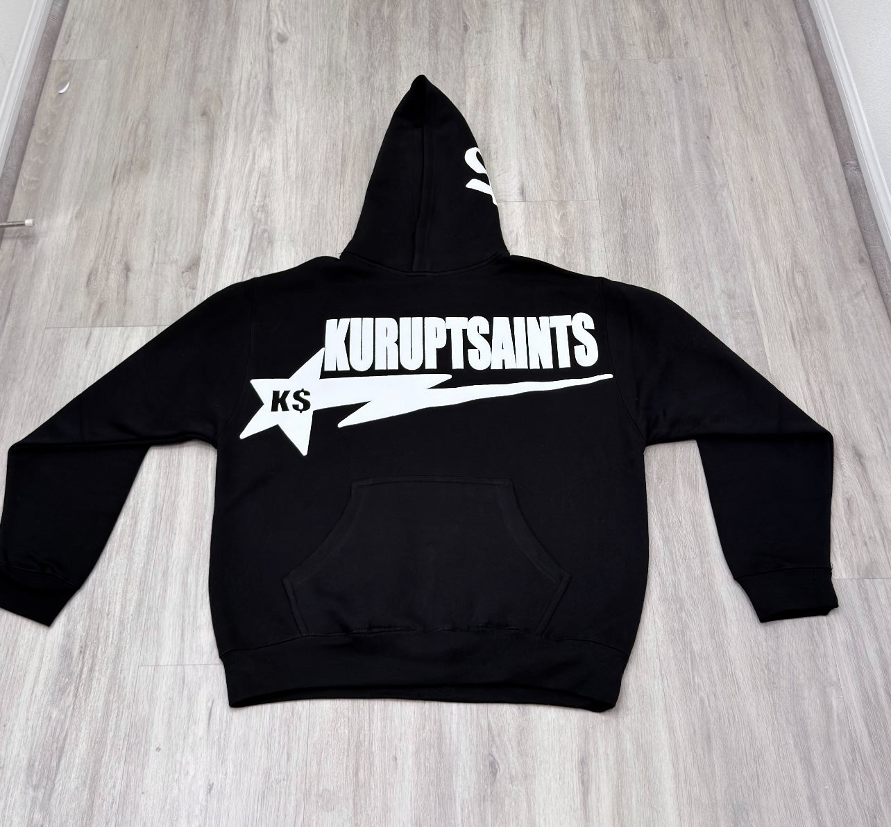Level up your streetwear rotation with the K$ Starstrike Hoodie, a bold statement piece straight from the Kurupt $aints lineup. Featuring the oversized KURUPT$AINTS graphic across the front with the signature shooting-star bolt + K$ logo, this hoodie delivers that loud, confident LA street identity that stands out in any fit.